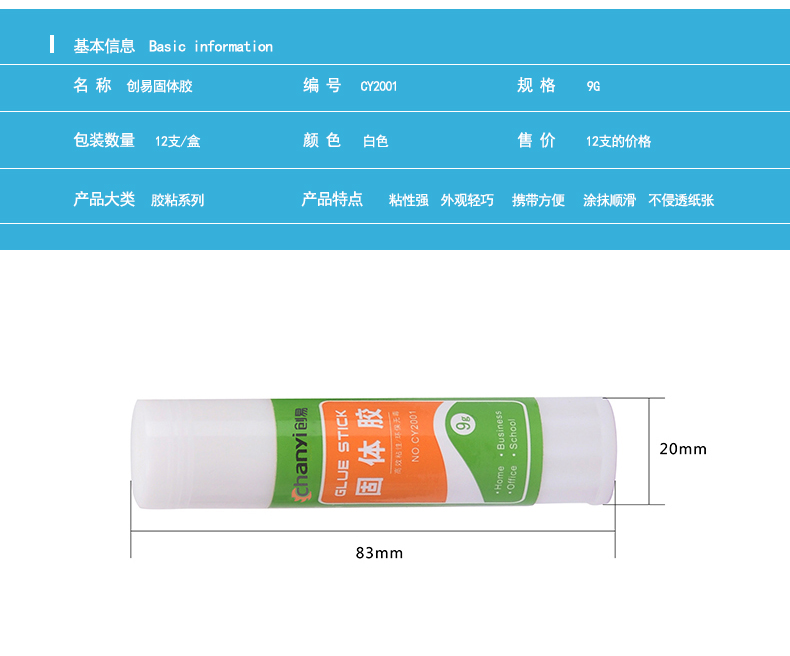 商品名称:创易 CY2001 固体胶9g 水高粘性固体胶胶棒儿童手工课胶水 办公用品胶 9g一支